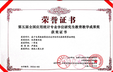 另外,在全国工业统计学教学研究会、中国现场统计研究会主办的《第五届全国应用统计专业学位研究生教育教学成果奖》评审中,我校高等教育研究院科教融合研究中心尹碧波教授的《基于电商数据聚类的近邻协同过滤推荐算法研究》荣获优秀案例奖一等奖。