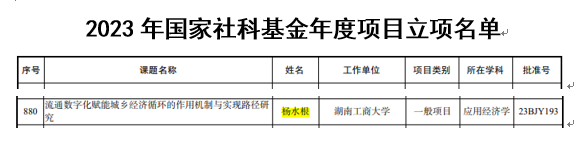 近日,2023年度国家社科基金立项名单公布,我校经济与贸易学院党委书记、高等教育研究院教育经济与管理研究中心成员杨水根教授申报的课题《流通数字化赋能城乡经济循环的作用机制与实现路径研究》获一般项目立项。