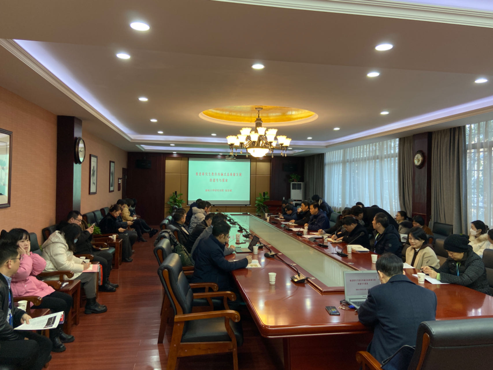 1月23日下午,由校研究生院、高等教育研究院联合举办的教育学术沙龙活动在岭南廉政中心206会议室进行,湖南大学研究生院院长张亚斌教授受邀作题为“推进研究生教育高质量发展的思考与探索”的讲座,学校副校长、高等教育研究院兼职院长刘国权教授主持,高等教育研究院各中心成员、各学院分管研究生教育工作的副院长及研究生院全体工作人员参加。